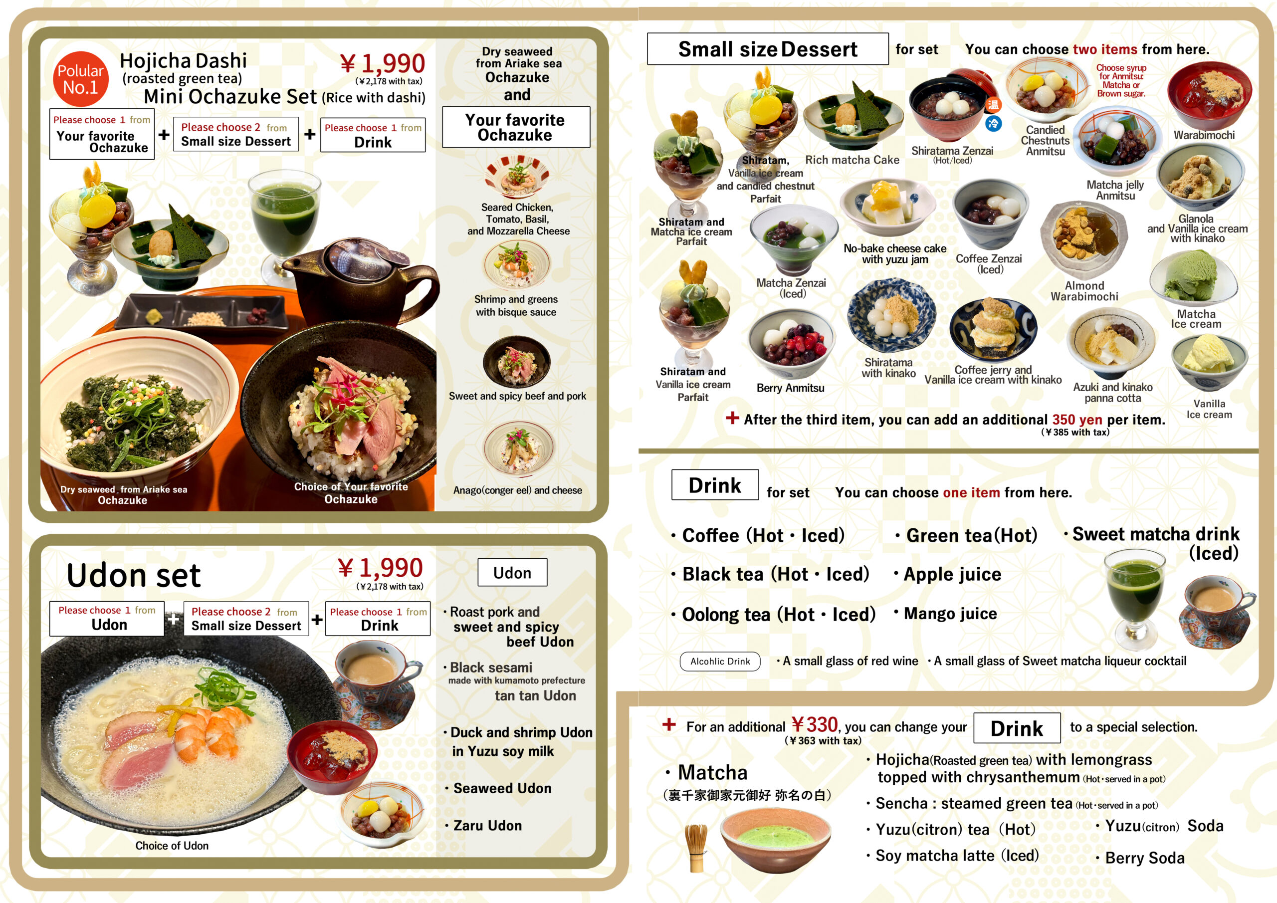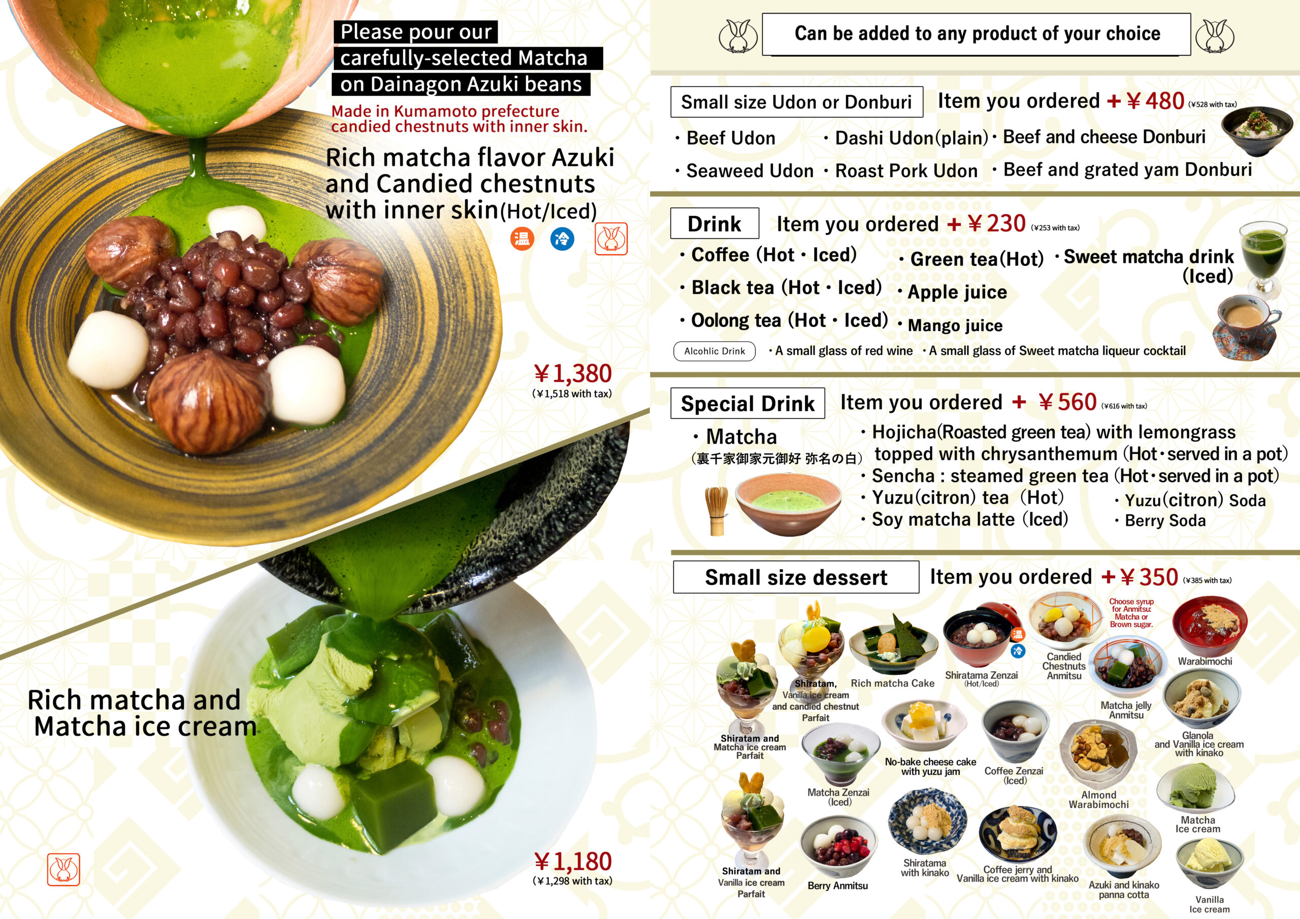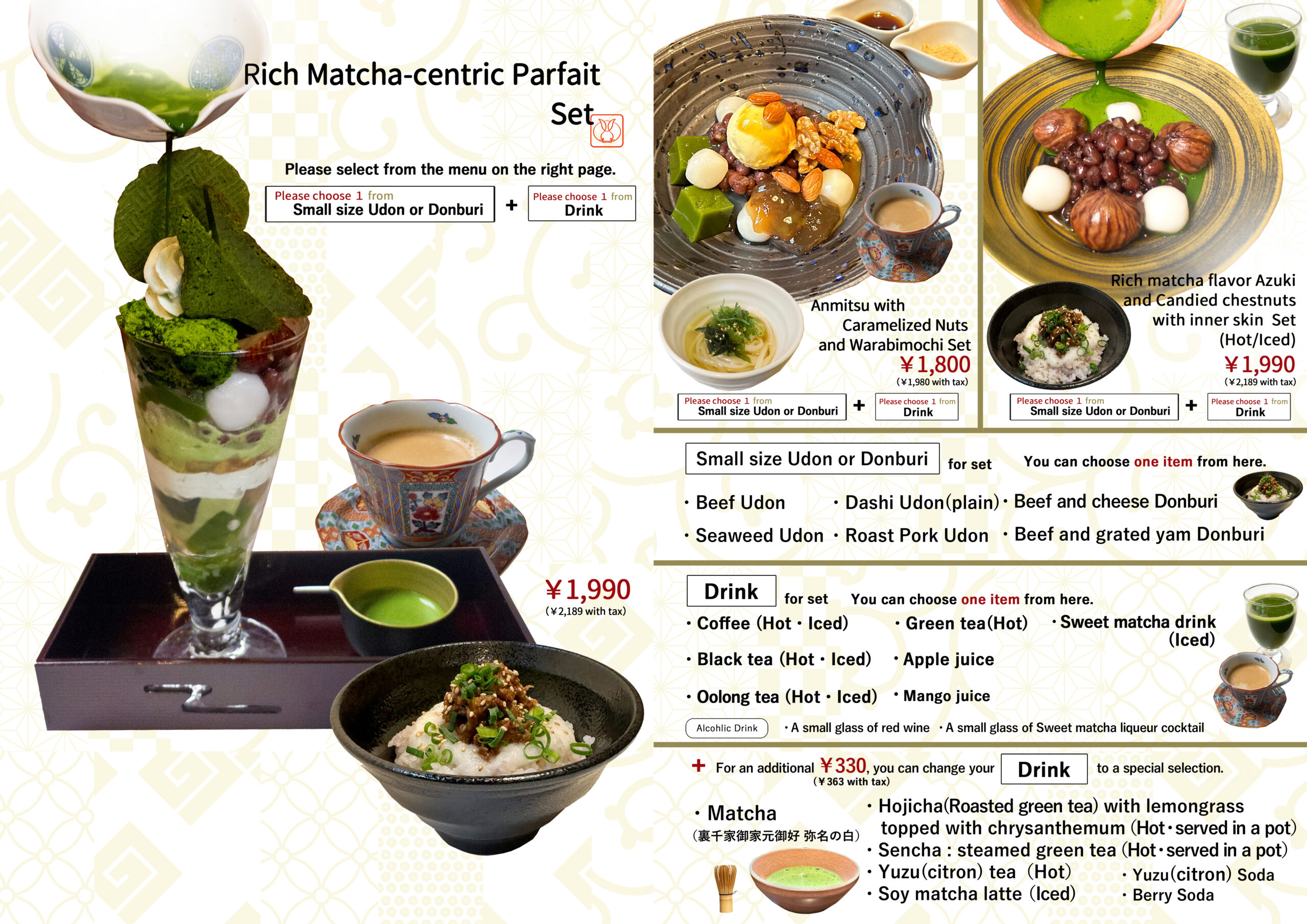 English menu available. Spring limited parfait Ice cream monaka Seared chiken and Mozzarella hot and sour Udon Pork cutlet rice soaked in Hojicha (roasted green tea) dashi soup set Set Menu Single item menu Dessert set Single item dessert Rich Matcha Series Zenzai Mix and Match Set and Single item Drink Take out