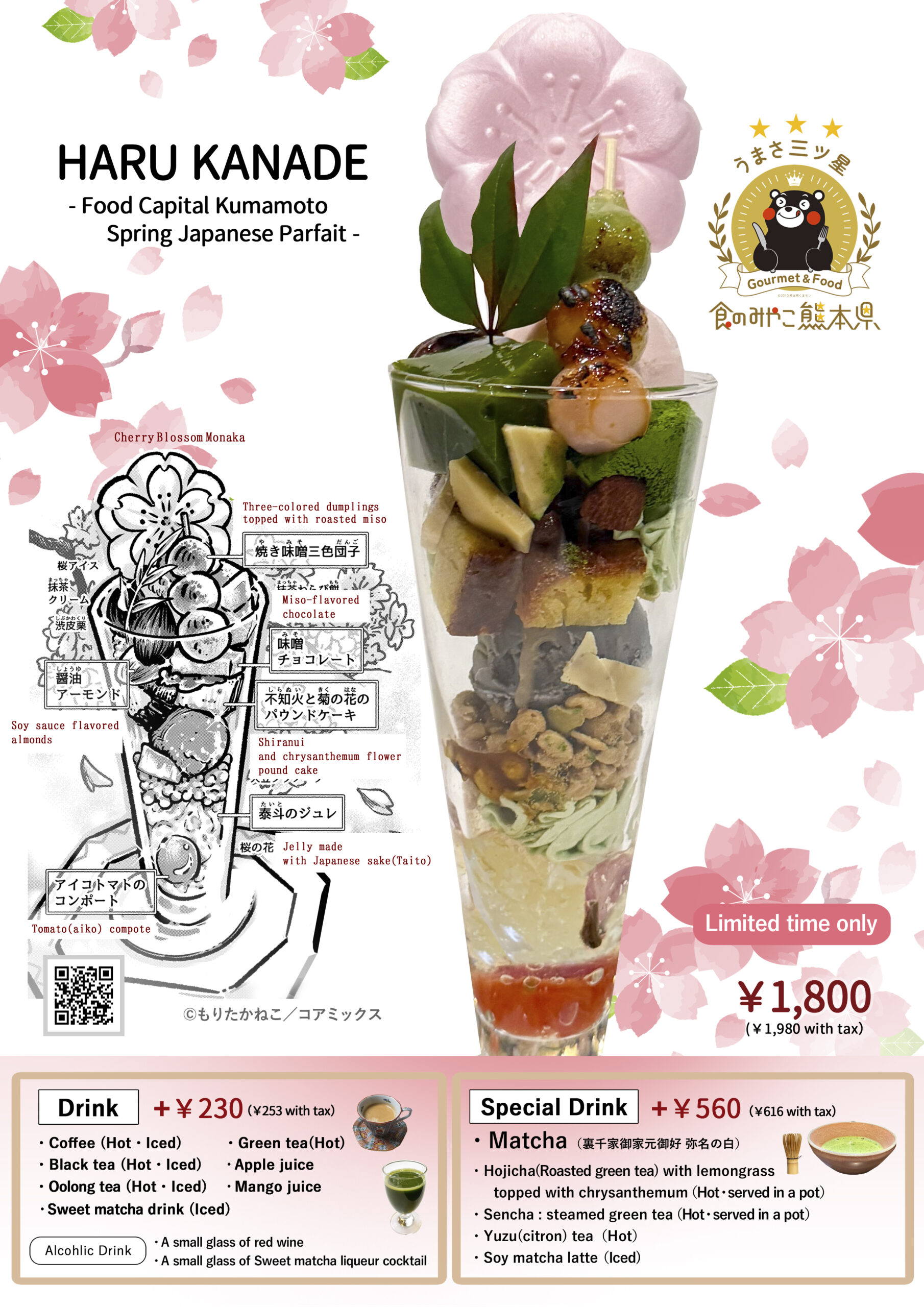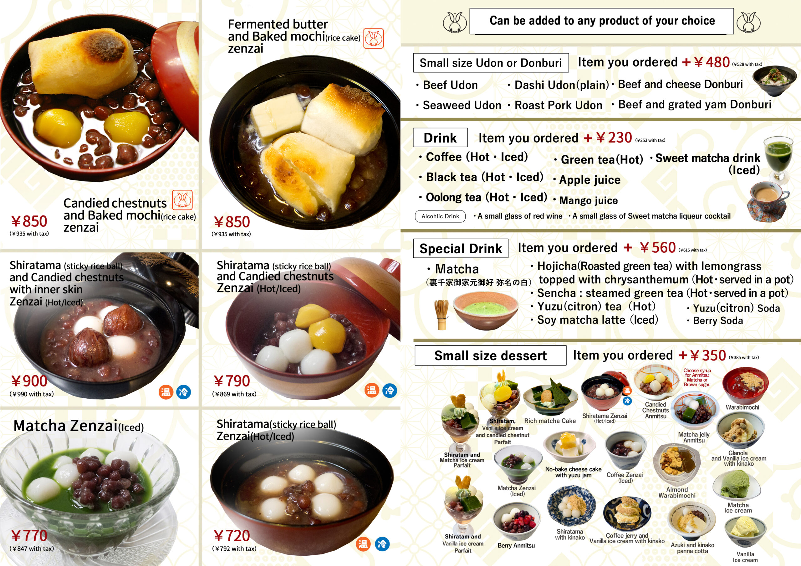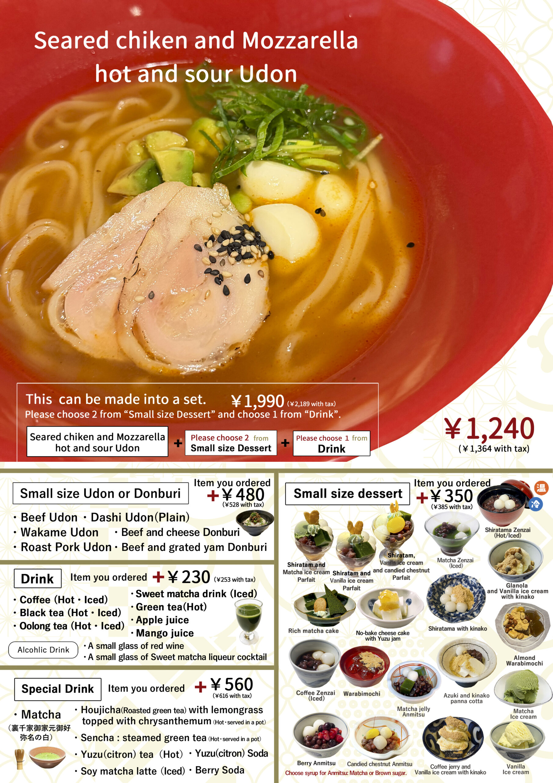 English menu available. Spring limited parfait Ice cream monaka Seared chiken and Mozzarella hot and sour Udon Pork cutlet rice soaked in Hojicha (roasted green tea) dashi soup set Set Menu Single item menu Dessert set Single item dessert Rich Matcha Series Zenzai Mix and Match Set and Single item Drink Take out